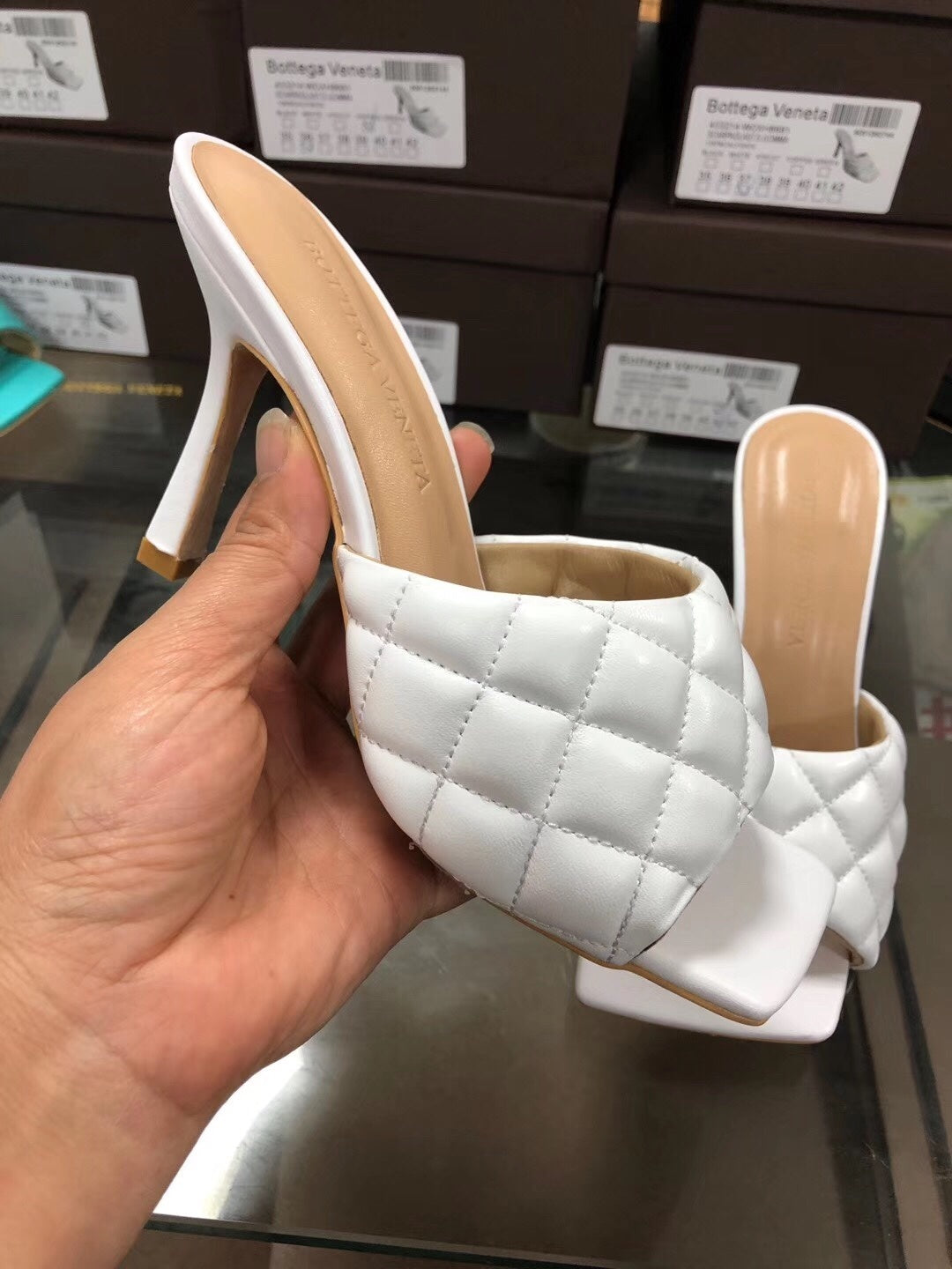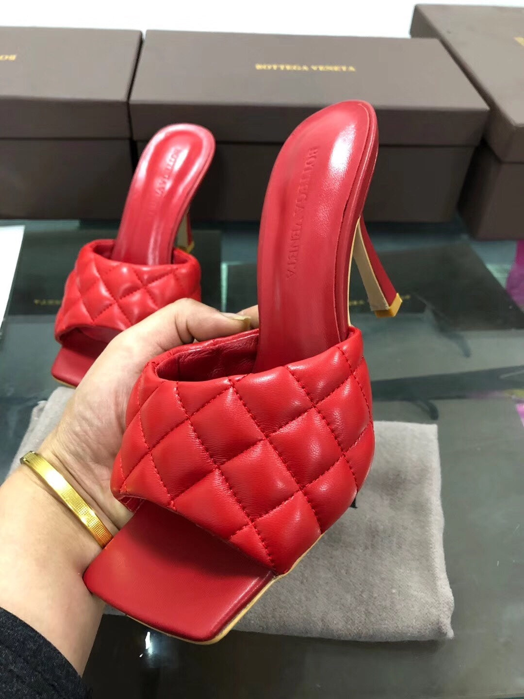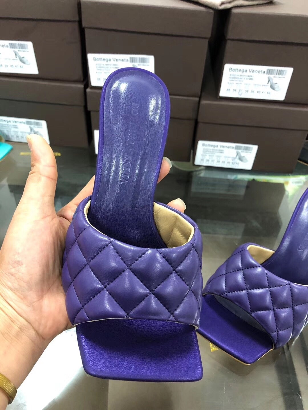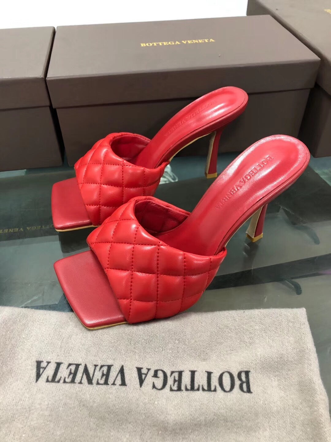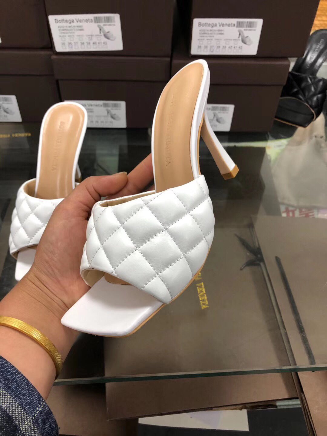 These BV (Bottega Veneta–style) high‑heeled slippers from the 2020 Early Spring collection combine luxurious materials with refined craftsmanship for an elegant, feminine look. The upper is made from imported sheepskin, lending the shoe a soft, supple texture with a richness that elevates its designer appeal. Inside, a goatskin insole provides a plush, luxurious base underfoot — goatskin is known for its fine grain, durability, and comfort, giving a refined feel.