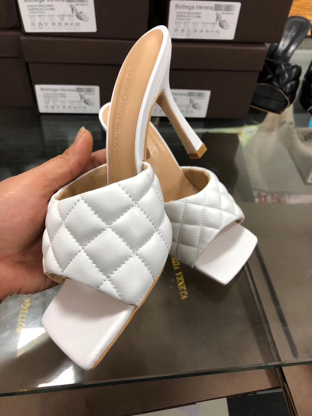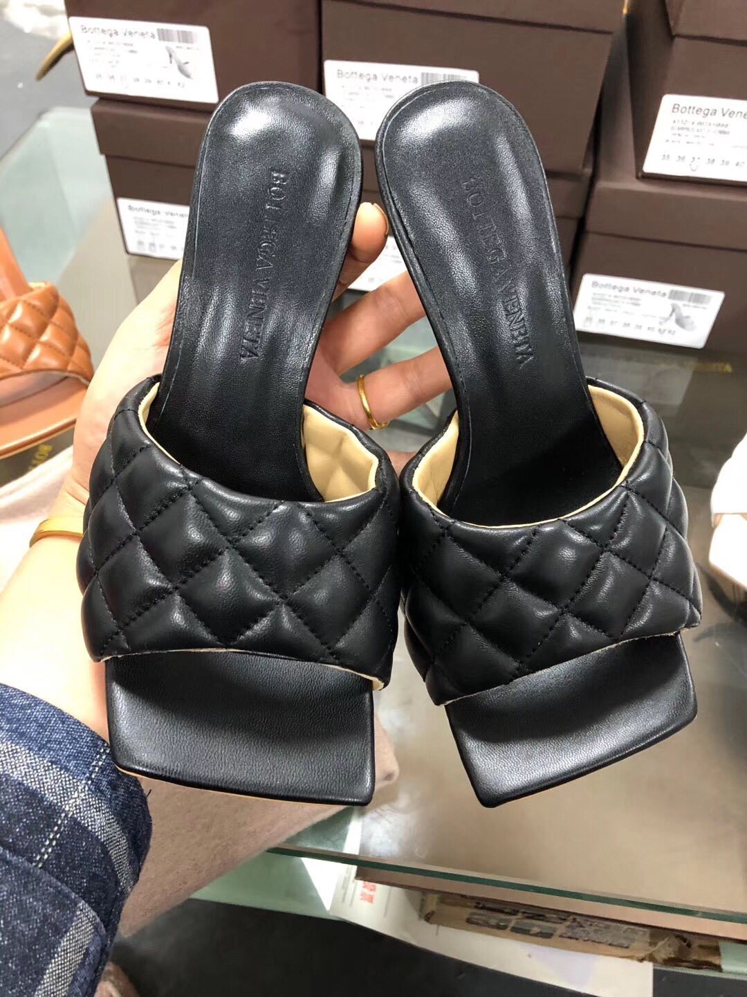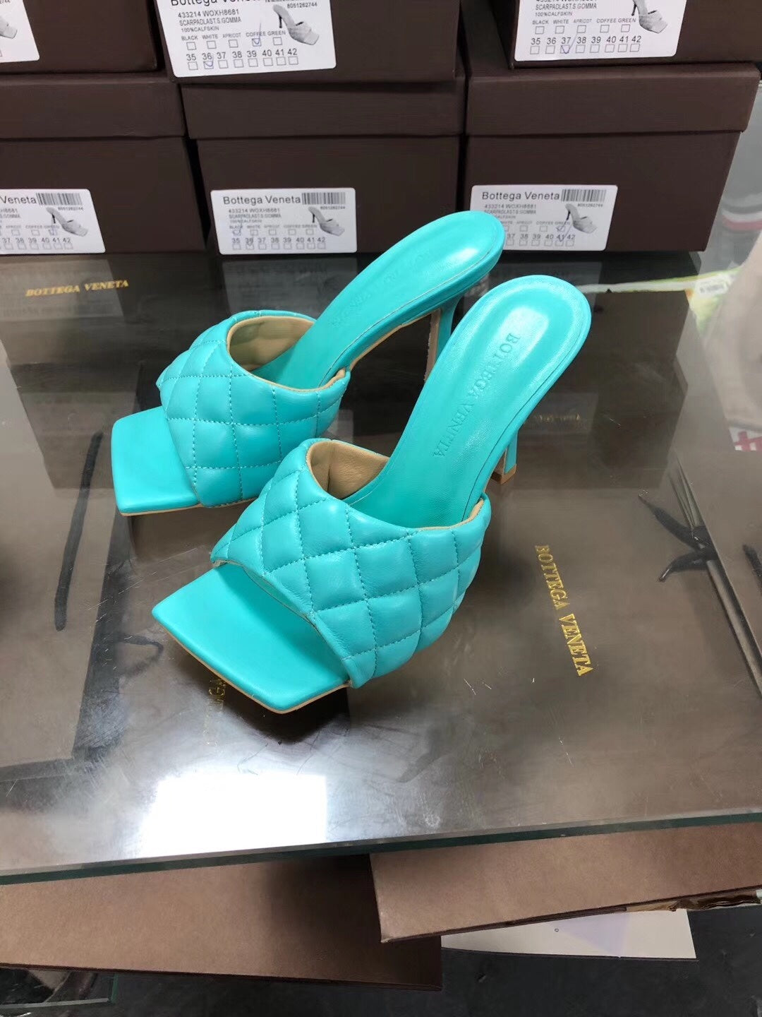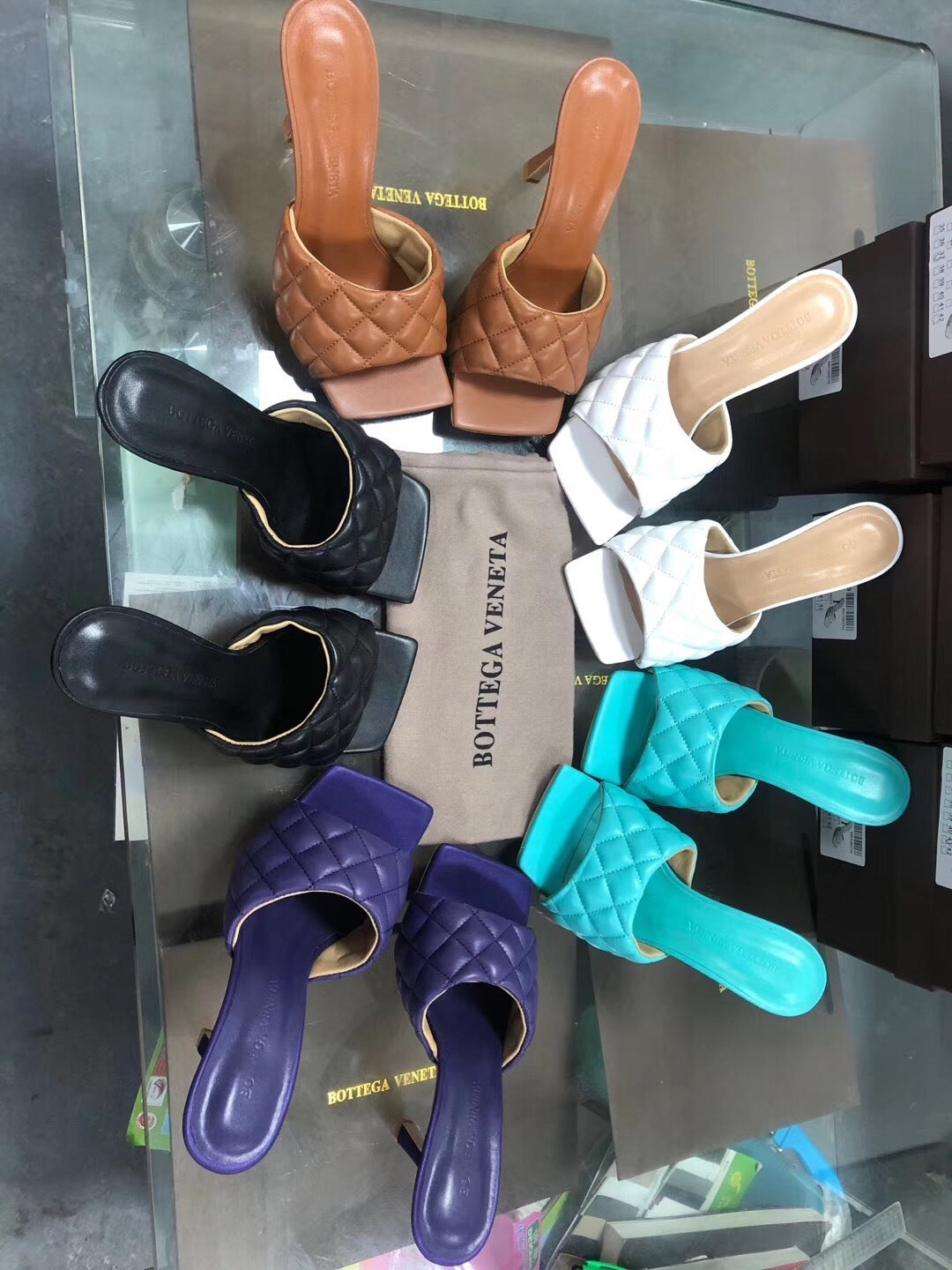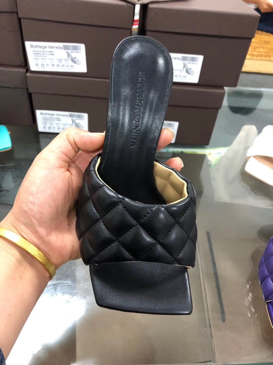 These BV (Bottega Veneta–style) high‑heeled slippers from the 2020 Early Spring collection combine luxurious materials with refined craftsmanship for an elegant, feminine look. The upper is made from imported sheepskin, lending the shoe a soft, supple texture with a richness that elevates its designer appeal. Inside, a goatskin insole provides a plush, luxurious base underfoot — goatskin is known for its fine grain, durability, and comfort, giving a refined feel.