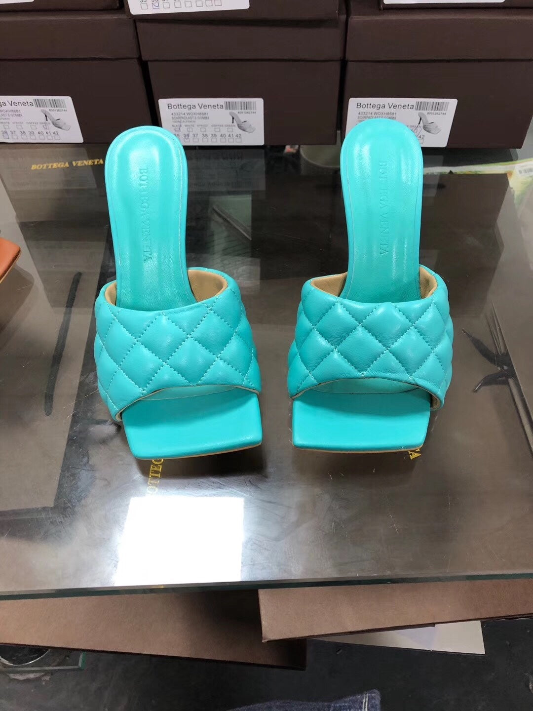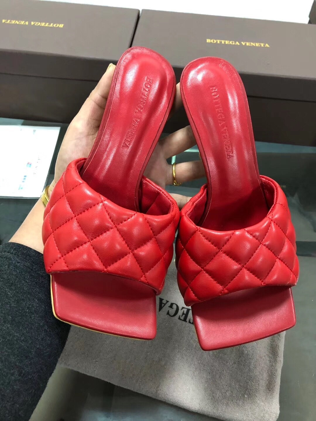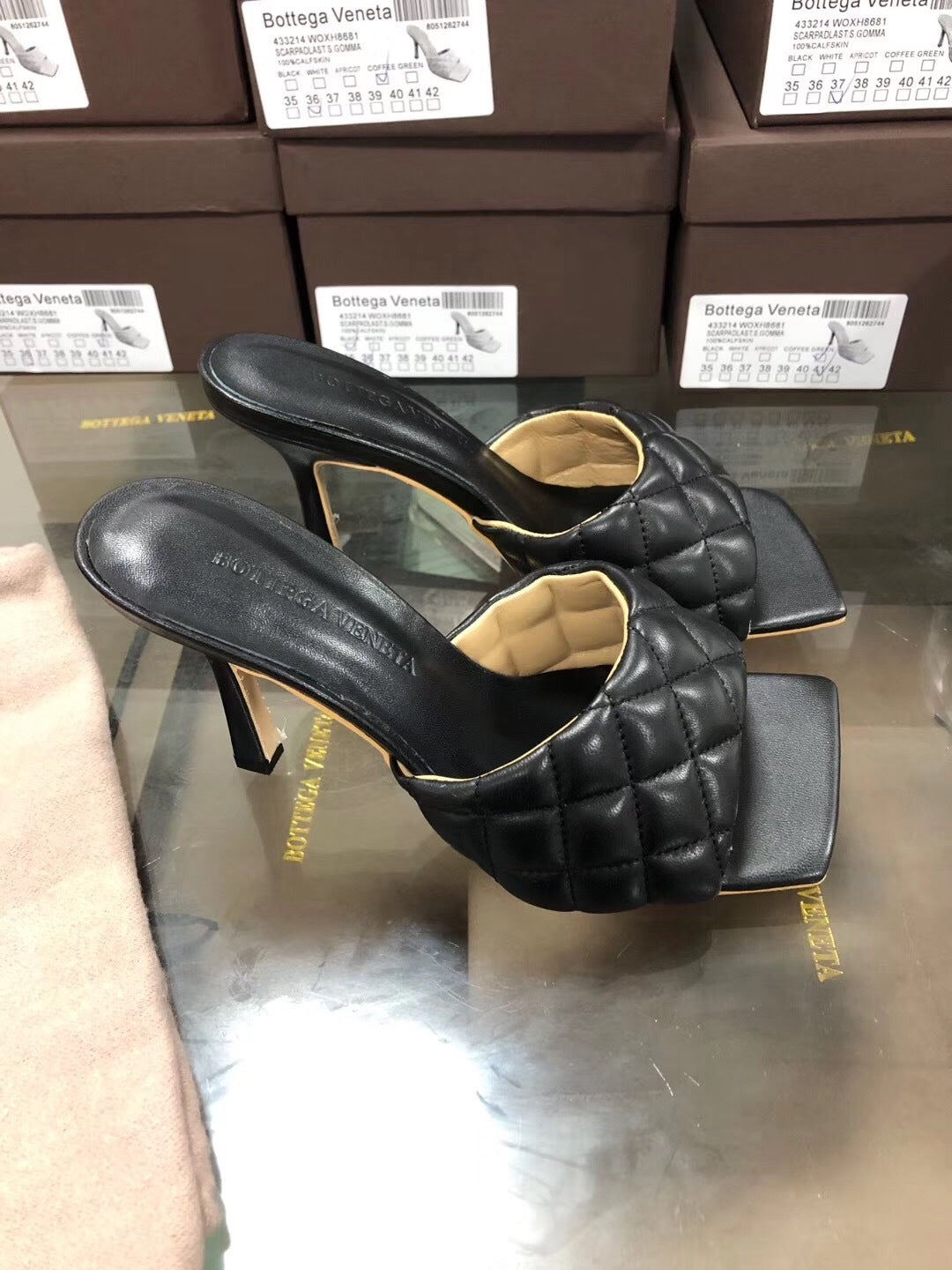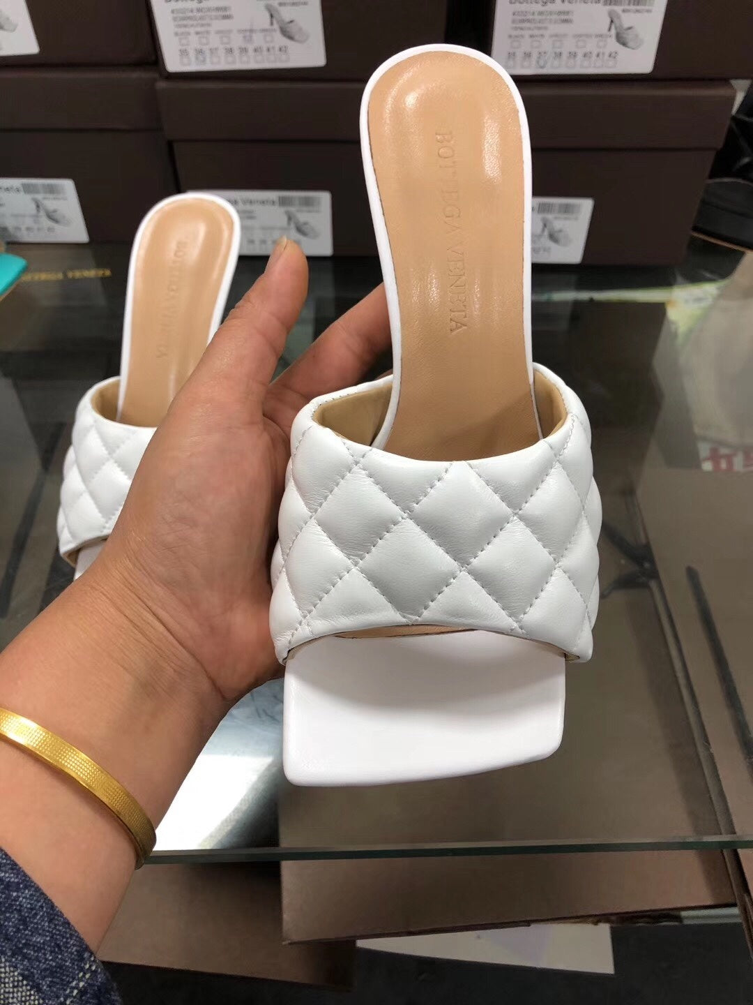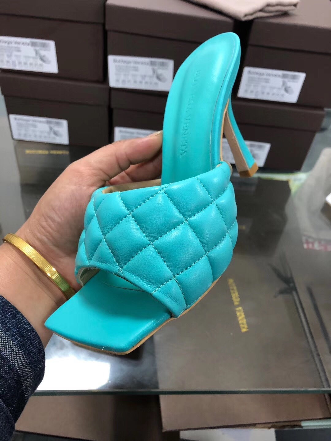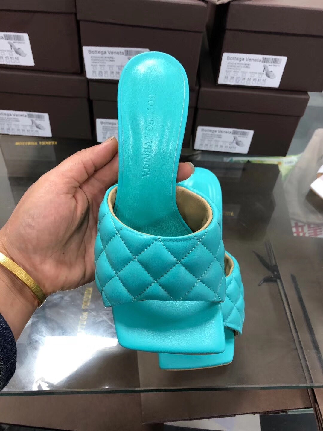 These BV (Bottega Veneta–style) high‑heeled slippers from the 2020 Early Spring collection combine luxurious materials with refined craftsmanship for an elegant, feminine look. The upper is made from imported sheepskin, lending the shoe a soft, supple texture with a richness that elevates its designer appeal. Inside, a goatskin insole provides a plush, luxurious base underfoot — goatskin is known for its fine grain, durability, and comfort, giving a refined feel.