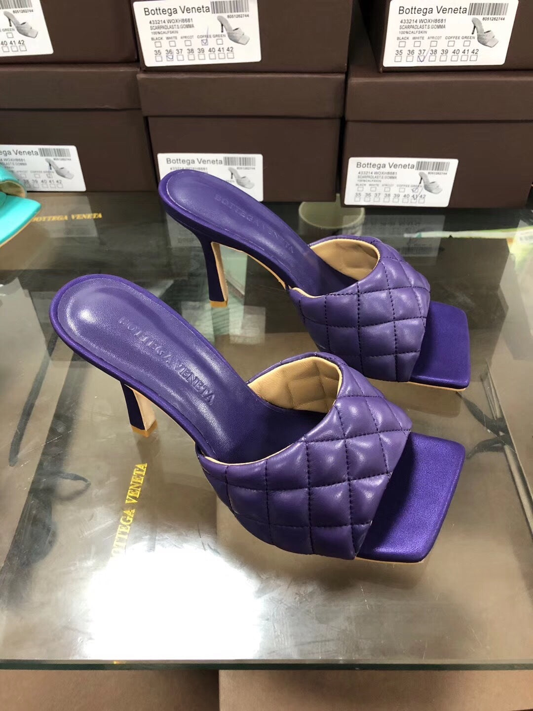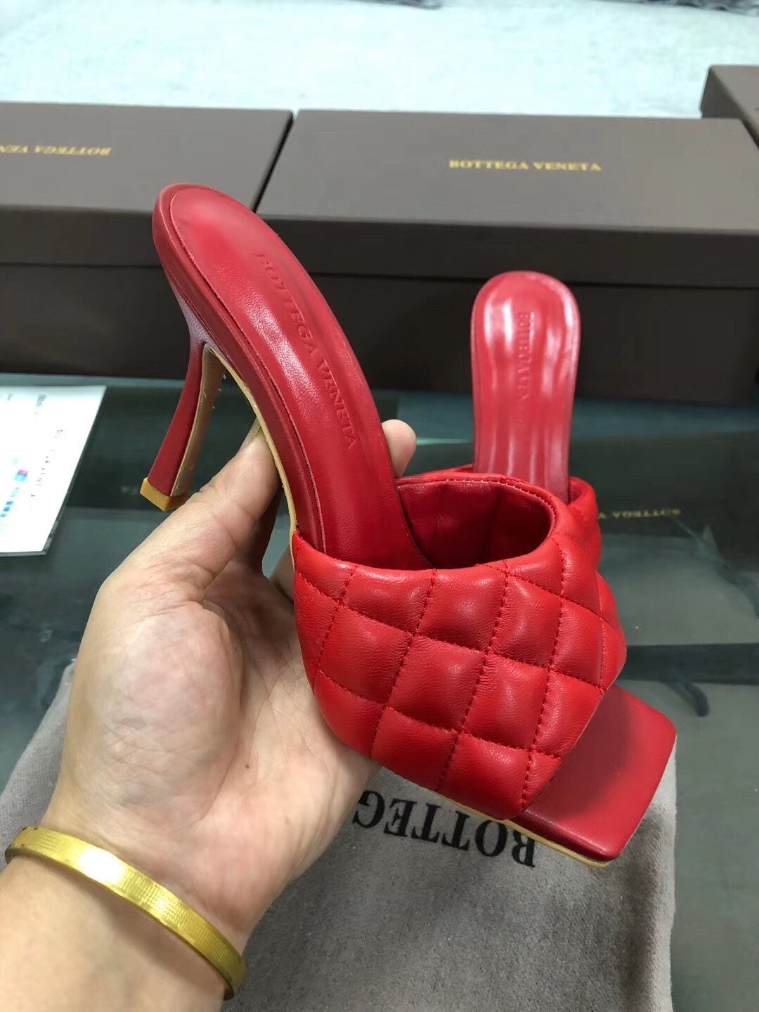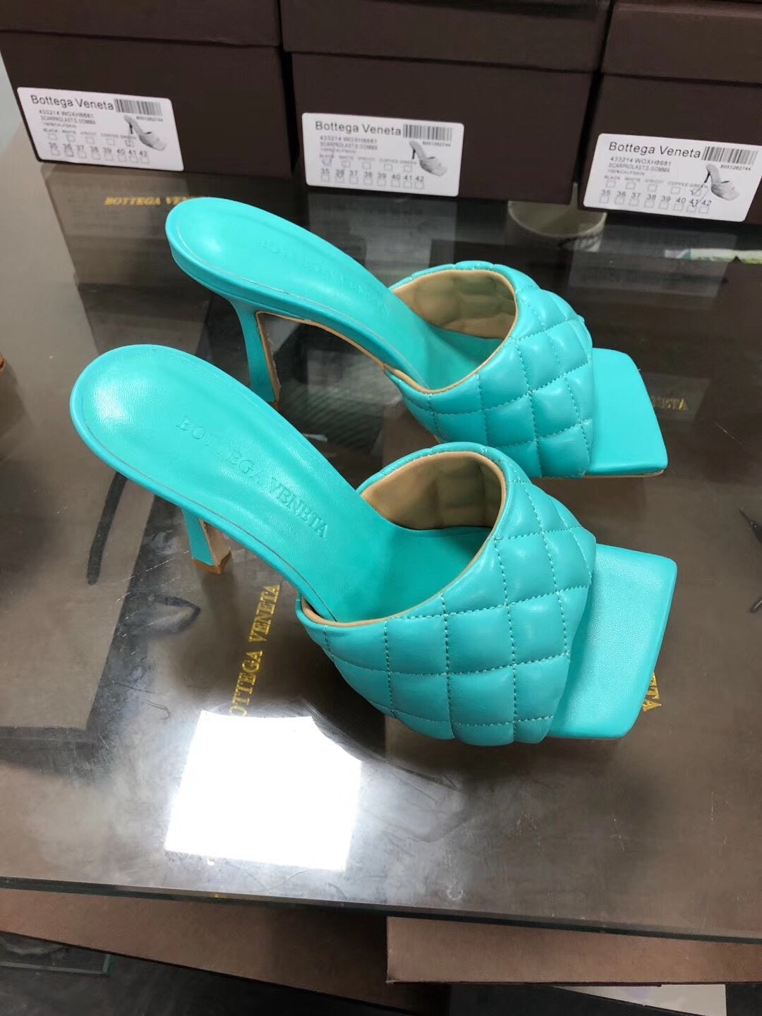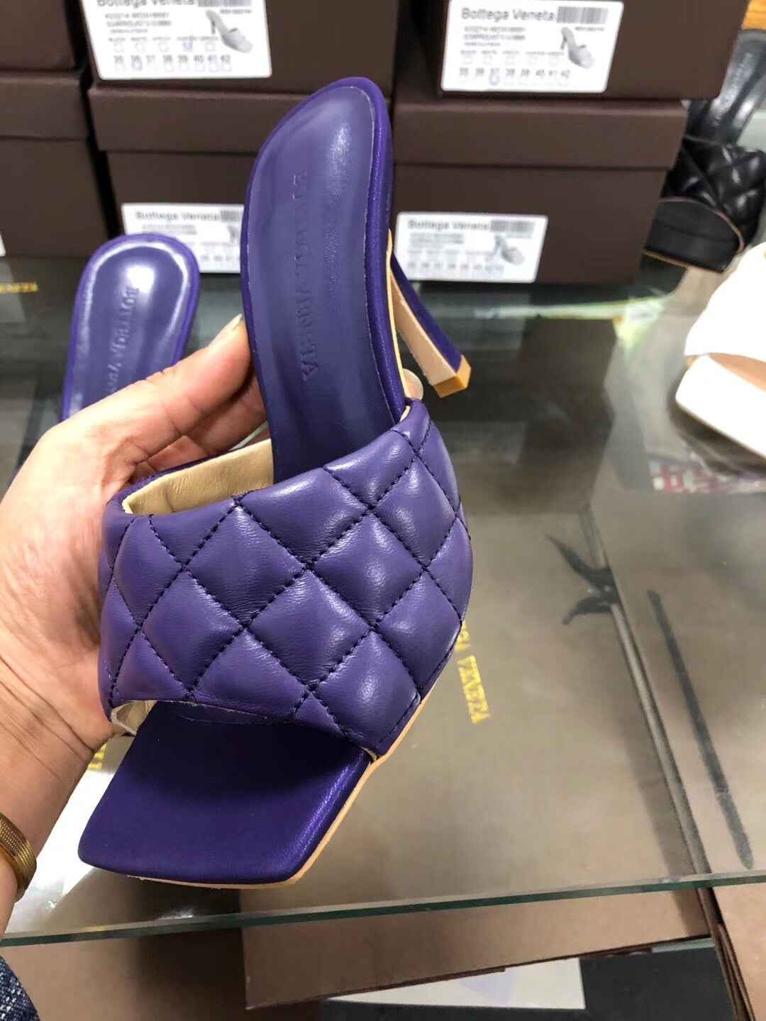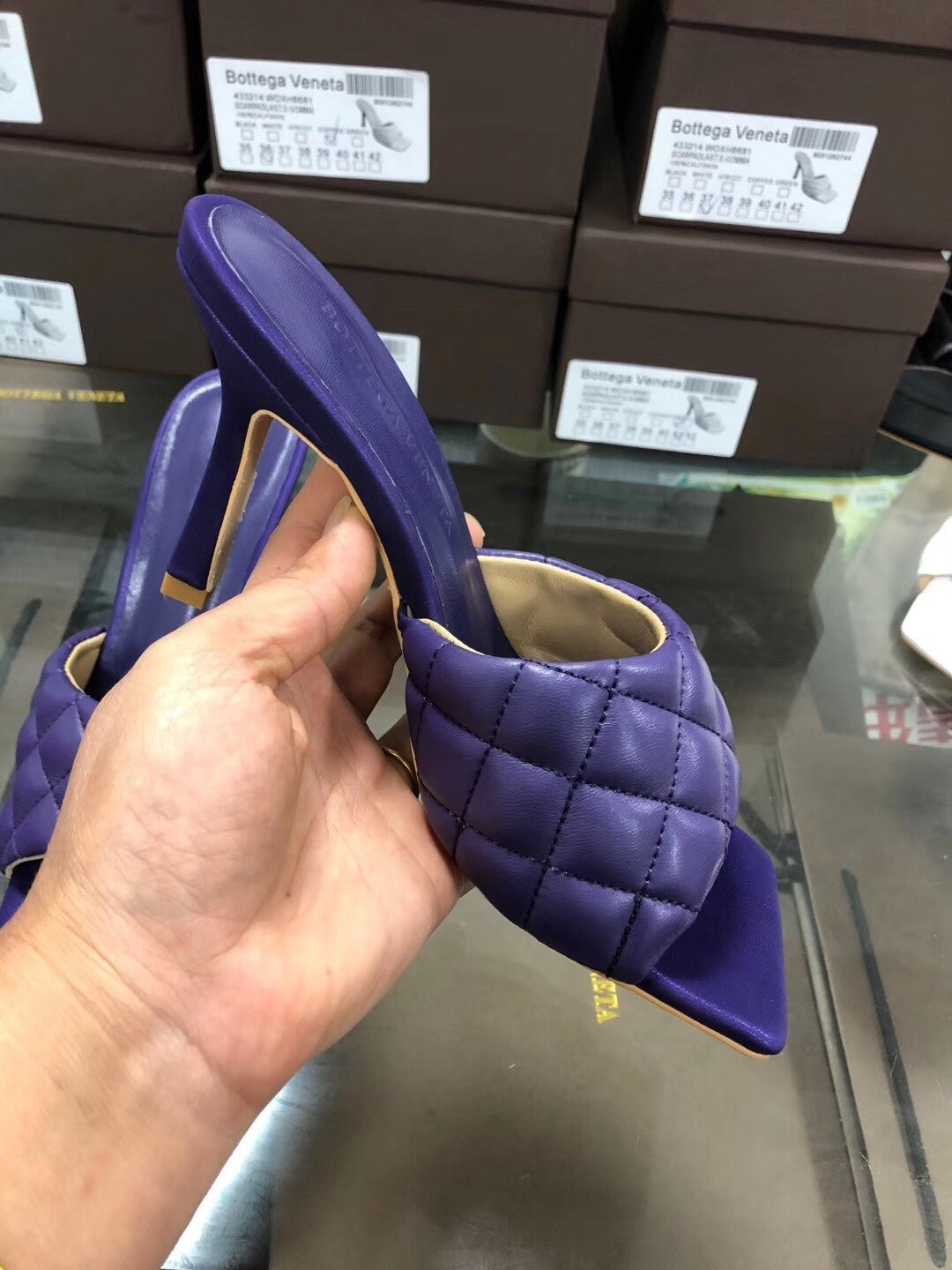 These BV (Bottega Veneta–style) high‑heeled slippers from the 2020 Early Spring collection combine luxurious materials with refined craftsmanship for an elegant, feminine look. The upper is made from imported sheepskin, lending the shoe a soft, supple texture with a richness that elevates its designer appeal. Inside, a goatskin insole provides a plush, luxurious base underfoot — goatskin is known for its fine grain, durability, and comfort, giving a refined feel.