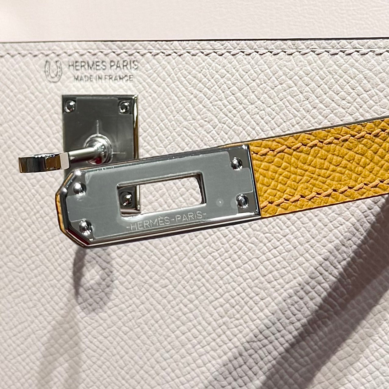 The Hermès Kelly Mini 20 Craie & Mauve Pale Epsom Leather Bag embodies timeless elegance in a compact form. Crafted from luxurious Epsom leather, this exquisite two-tone design blends the soft neutrality of Craie with the delicate sophistication of Mauve Pale. Accented with palladium-plated hardware, this mini Kelly is a statement of refined craftsmanship and effortless Parisian charm — perfect for both day and evening wear.