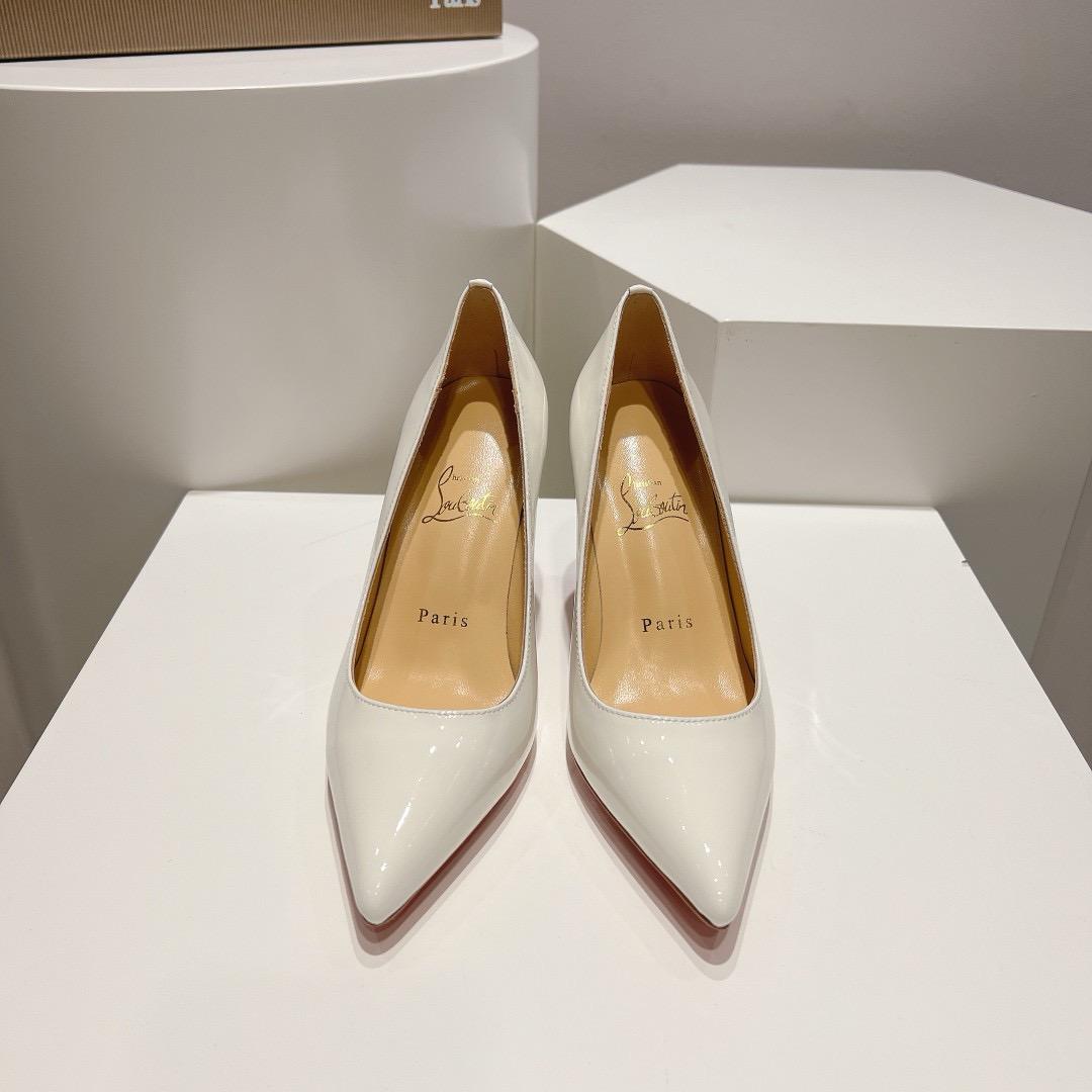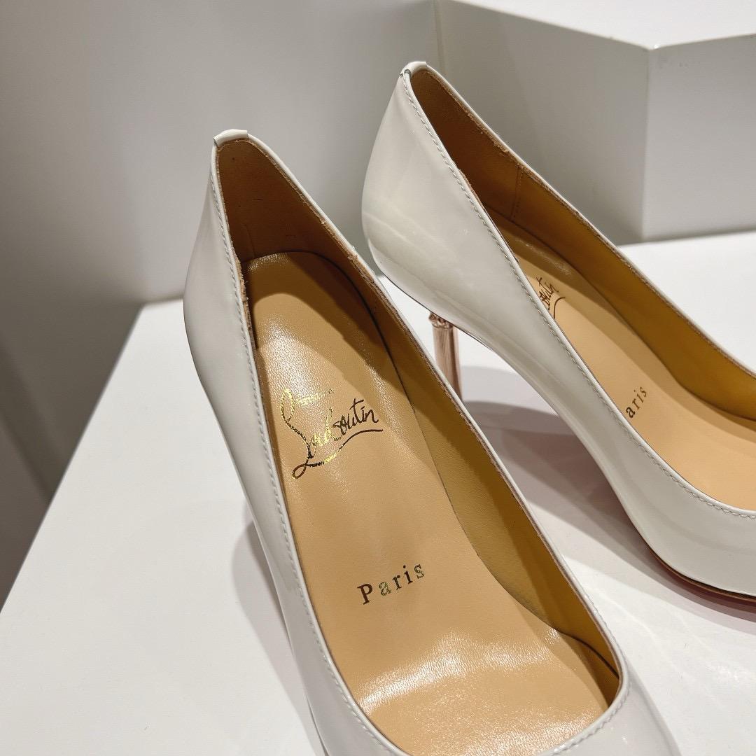 White high-heeled shoes with gold accents on a white platform, featuring the Christian Louboutin logo.