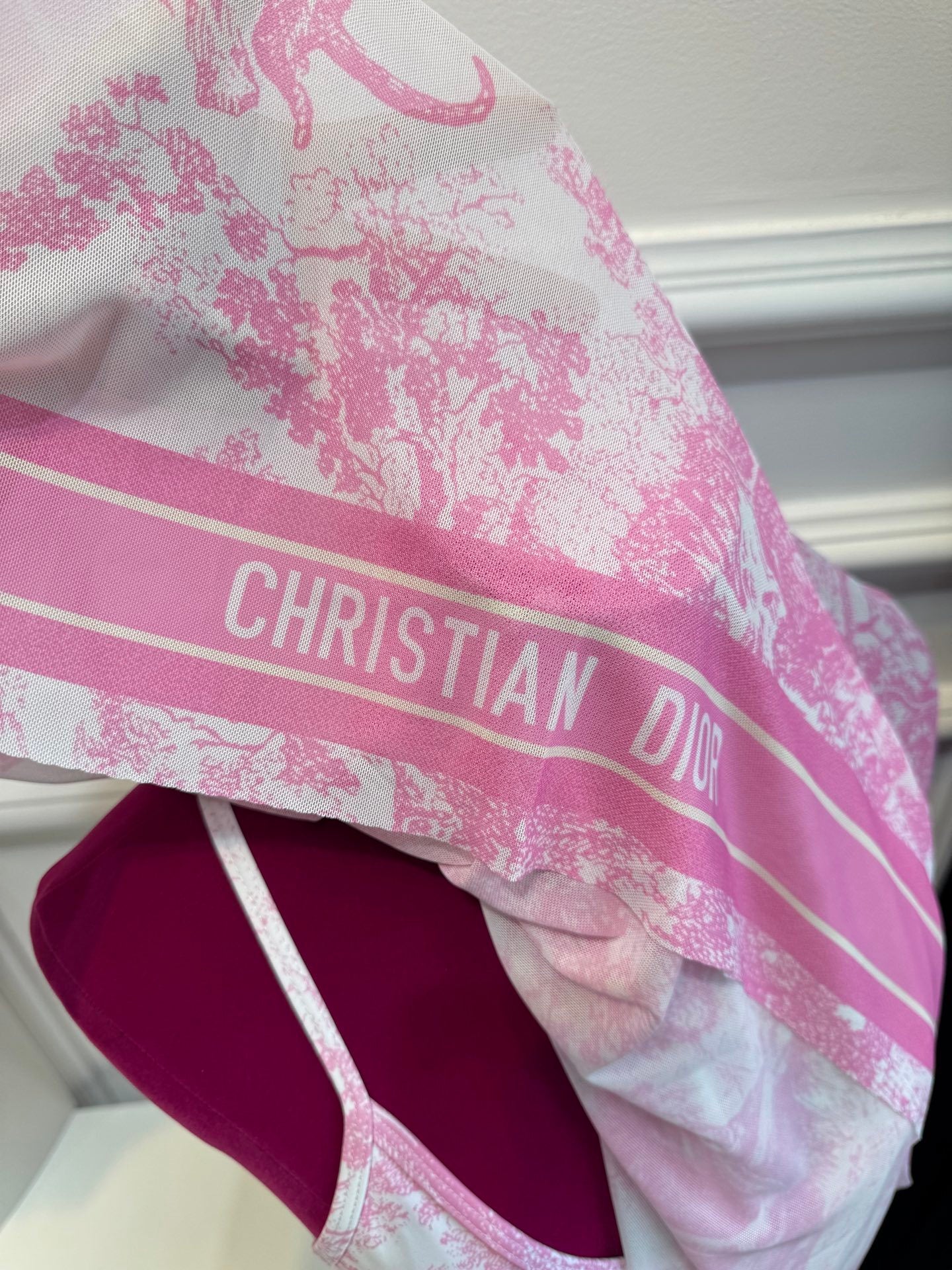 Experience luxury swimwear with the Di One-Piece Swimsuit from the Dioriv Limited Edition Collection featuring a white base with cherry blossom blue/pink Sauvage print, a fresh reinterpretation of Dior’s classic pattern. Crafted from technical fabric for a comfortable, durable fit, it comes with a matching scarf included for free (official website price 5k). Slight color differences may occur between swimsuit and scarf but do not affect the overall design. Perfect for a sophisticated and stylish beach or pool look.