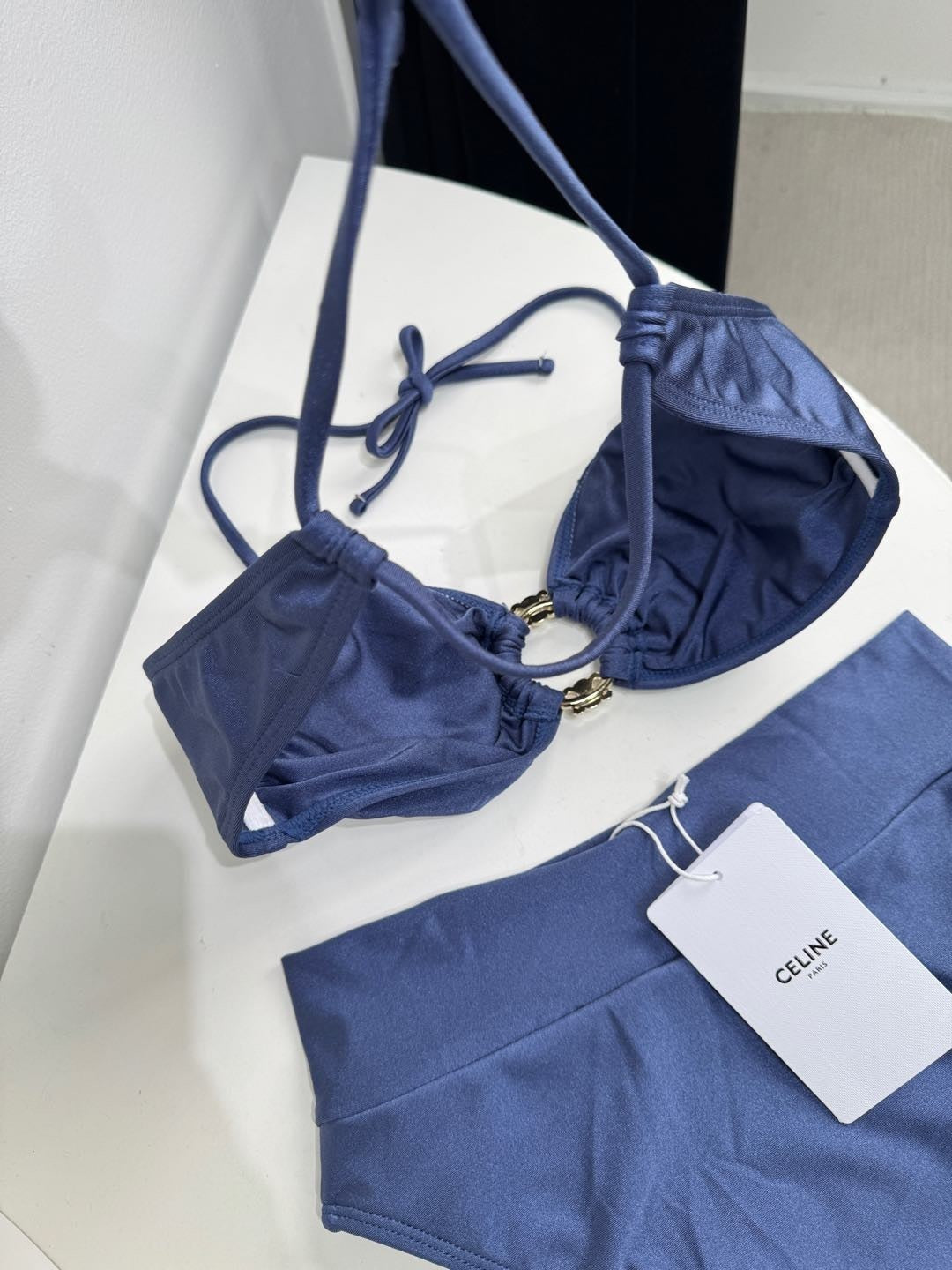 - Design: Strapless bikini with classic metal buckle accents