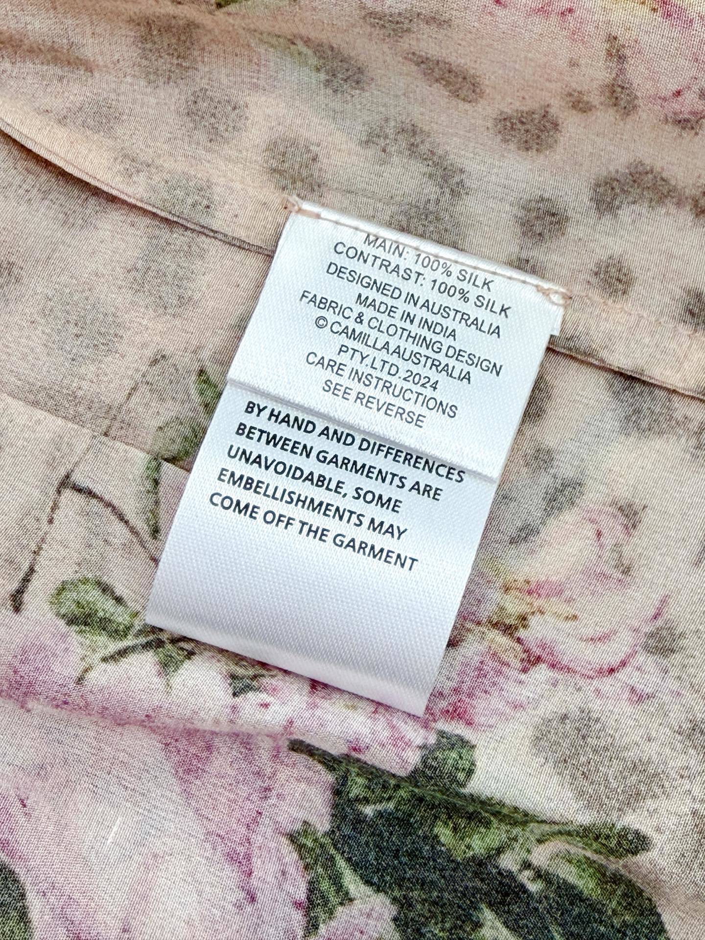 - Details: Flowing ruffled hem, uniquely positioned floral print