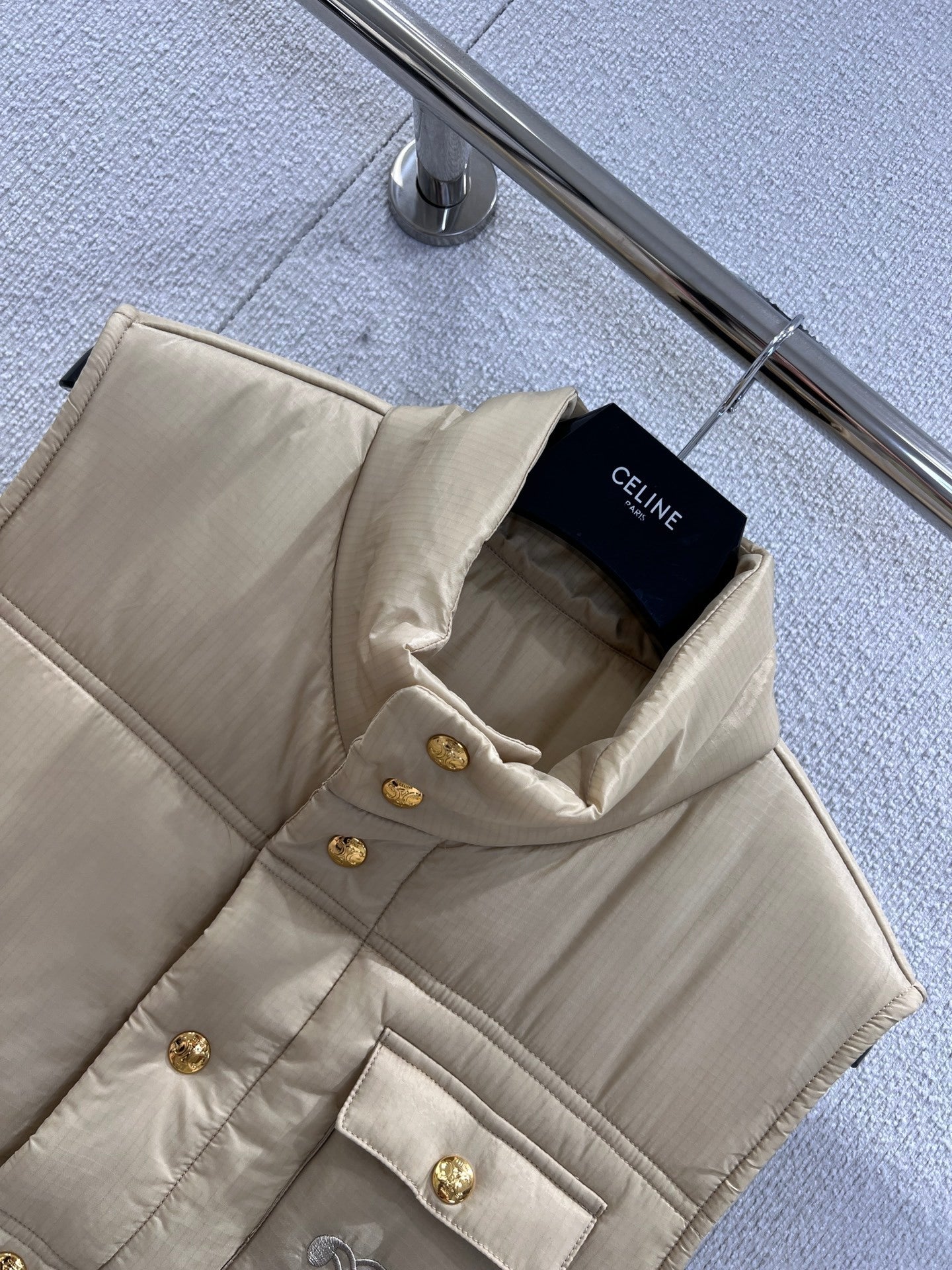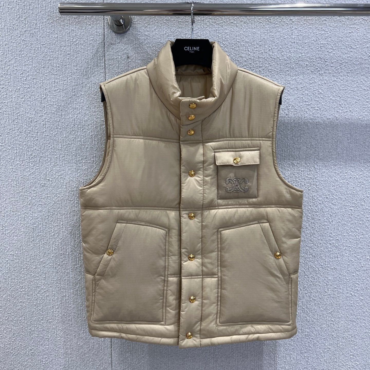 Upgrade your layering game with the Celin 25FW Autumn/Winter Triumphal Arch Cotton Vest*, crafted with exclusive high-quality production. Made from matte, slightly wrinkled nylon with a subtle sheen and lightweight, warm cotton filling, this vest offers both comfort and sophistication. Features delicate checkered quilting, a short adjustable stand collar for versatile layering, and all-over metal snap buttons with a vintage golden luster, combining luxury with casual style.